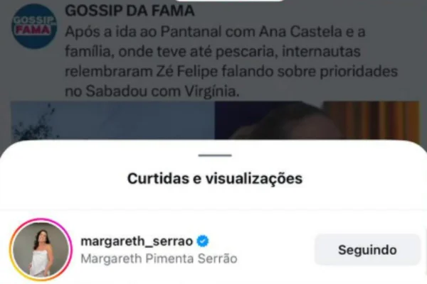 O post voltou a circular recentemente após a viagem de Zé Felipe ao Pantanal na companhia de Ana Castela, e a interação de Margareth Serrão com o conteúdo, ao deixar um “like”, chamou a atenção dos internautas, indicando que a mãe de Virginia está atenta às notícias relacionadas ao seu ex-genro.