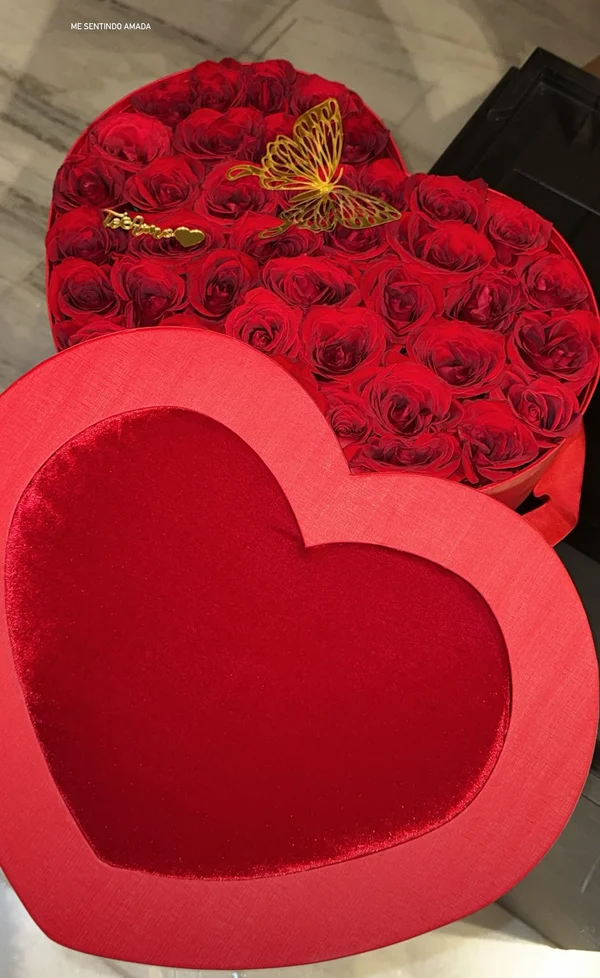 Entre as cenas dos cachorrinhos tentando pular nela e do carinho da ex-sogra, dona Teresinha, mãe de Belo que mora com ela, um presente romântico chamou a atenção: rosas vermelhas dentro de uma caixa em forma de coração, com direito a uma borboleta dourada.