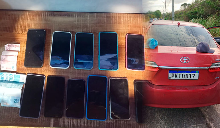 Na busca veicular, foram encontrados 11 aparelhos celulares, todos sem nota fiscal e sem que os indivíduos soubessem informar a procedência. Além disso, o sistema policial indicou que o veículo apresentava restrição judicial, reforçando as suspeitas sobre a origem do automóvel.