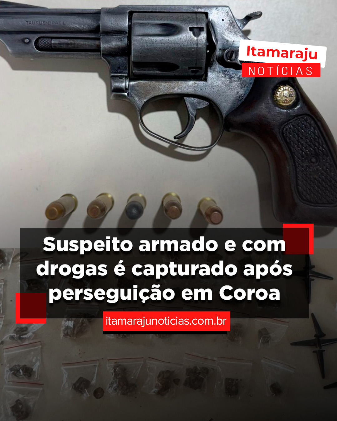 Durante a revista pessoal, os policiais encontraram um revólver calibre .38 carregado com cinco munições intactas. Além disso, o suspeito carregava uma pochete contendo drogas, dinheiro em espécie e um aparelho celular, levantando ainda mais suspeitas sobre sua atividade criminosa.
