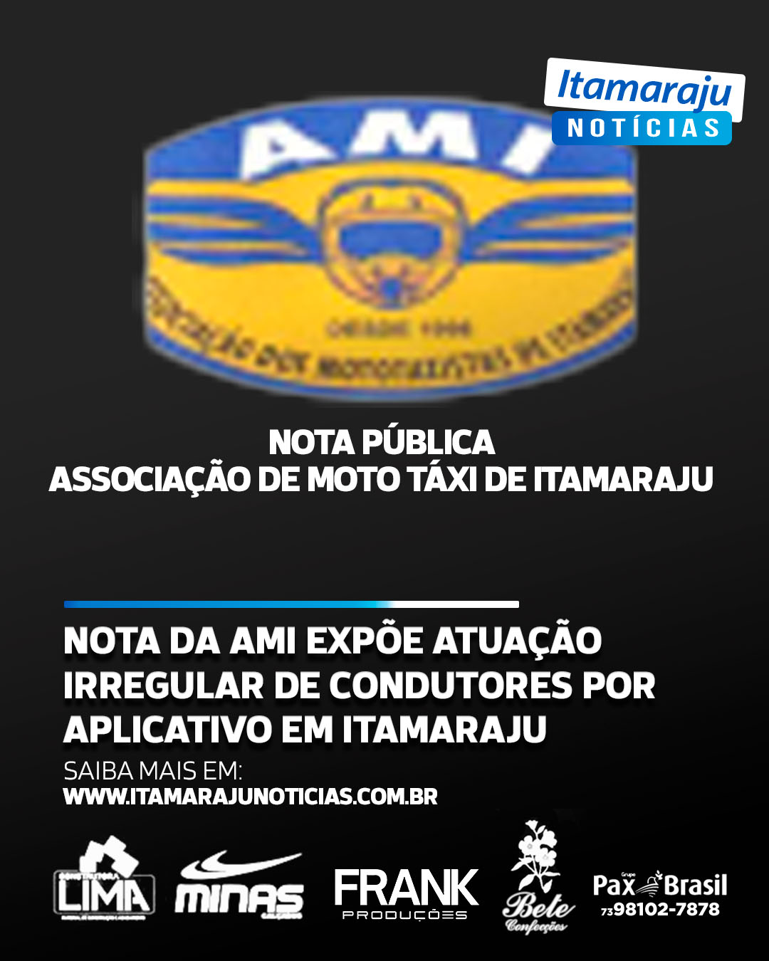 A Associação de Moto Táxi de Itamaraju (AMI) vem, por meio desta nota, esclarecer à sociedade que a pessoa detida em recente ação da Polícia Civil, acusada de envolvimento com tráfico de drogas, não integra o quadro de associados desta entidade.